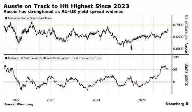 2026年以来,澳元兑美元汇率已累计上涨近4%,目前报约0.69,跻身今年迄今十国集团货币涨幅前三。澳大利亚联邦银行和西太平洋银行的策略师均预测,澳元有望在3月底前升至0.70,这一价位上一次出现还是在2023年初。